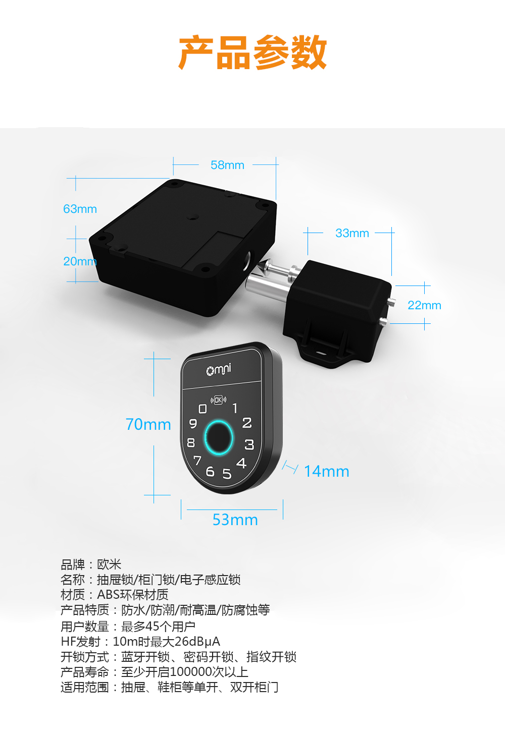 品牌︰歐米 名稱:抽屜鎖/柜門鎖/電子感應鎖 材質:ABS環保材質 產品特質︰防水/防潮/耐高溫/防腐蝕等 用戶數量:最多45個用戶 HF發射: 10m時最大26dBuA 開鎖方式:藍牙開鎖、密碼開鎖、指紋開鎖 產品壽命:至少開啟100000次以上 適用范圍︰抽屜、鞋柜等單開、雙開柜門